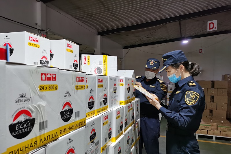 圖為:關(guān)員正在對出口面條進(jìn)行查驗? 萬雷/攝